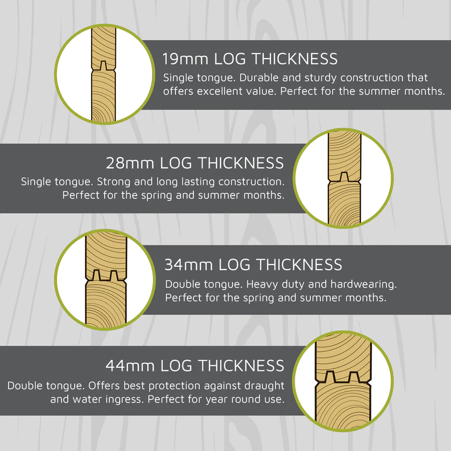 We manufacture this log cabin using high quality, 44mm timber log boards. The boards interlock to create a tight seal against water ingress and draughts. Providing an extremely robust and solid structure. The solid 44mm boards offer great heat retention, meaning you can use this cabin all year round! The roof and floor are made using tongue and groove boards that form a heavy-duty finish. Perfect for frequently used buildings and for holding heavy furniture. The roof is covered with high-quality roofing felt as standard. Providing further protection against the weather.